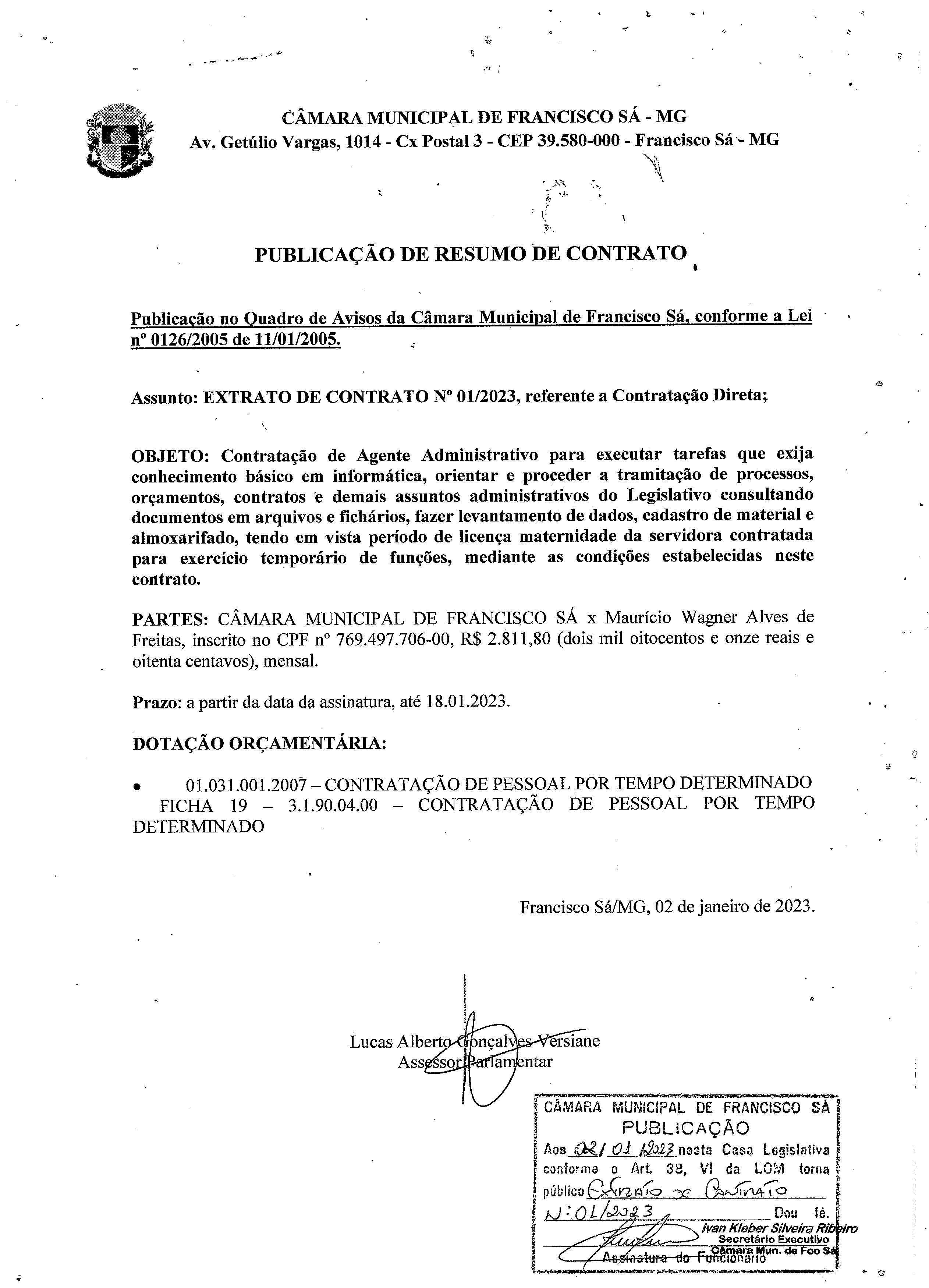 Extrato de Publicação do Contrato N.º 001/2023 - Contratação: Direta - Cargo: Agente Administrativo - Contratado: Maurício Wagner Alves de Freitas