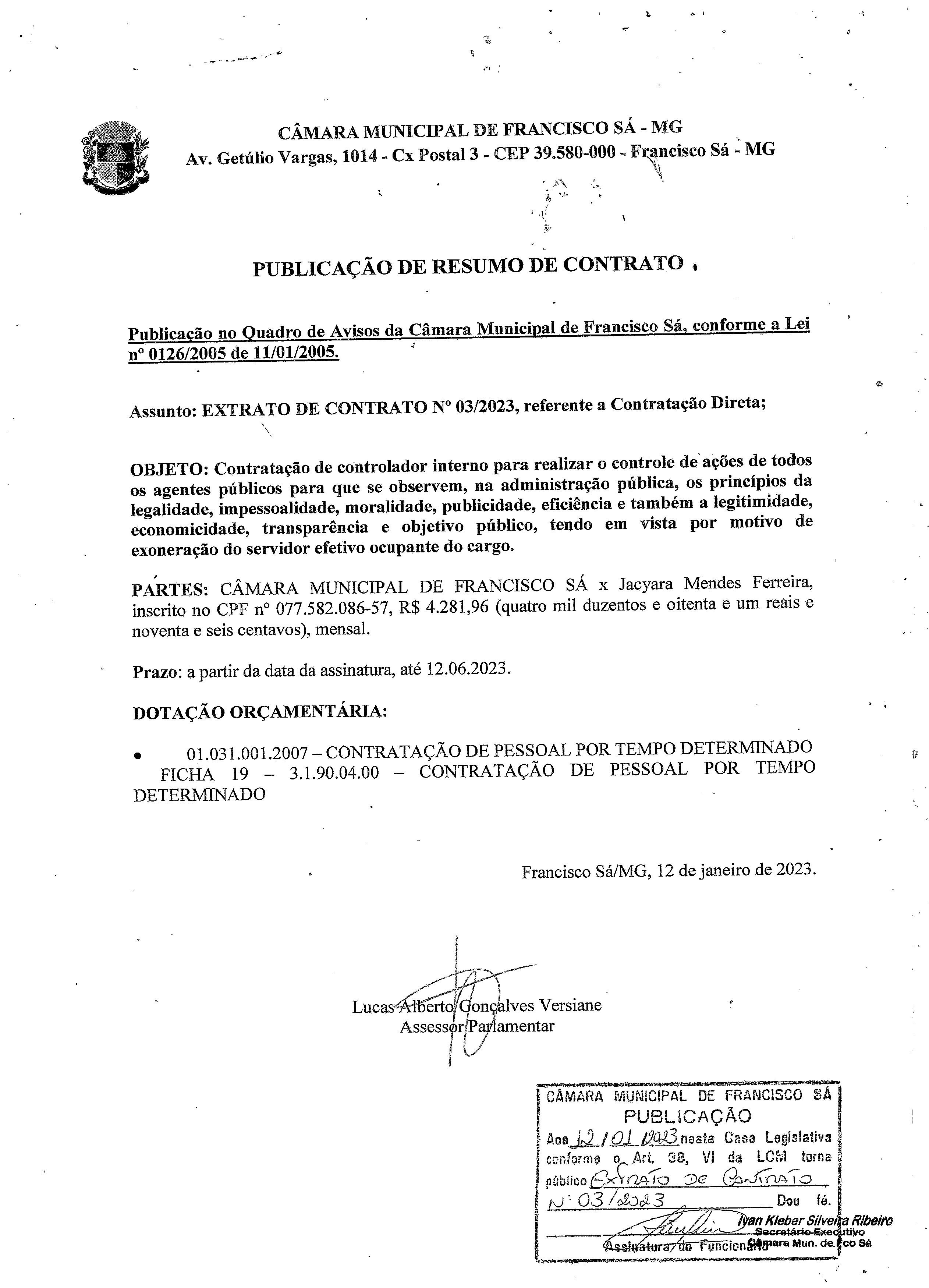 Extrato de Publicação do Contrato N.º 003/2023 - Contratação: Direta - Cargo: Controlador Interno - Contratada: Jacyara Mendes Ferreira.