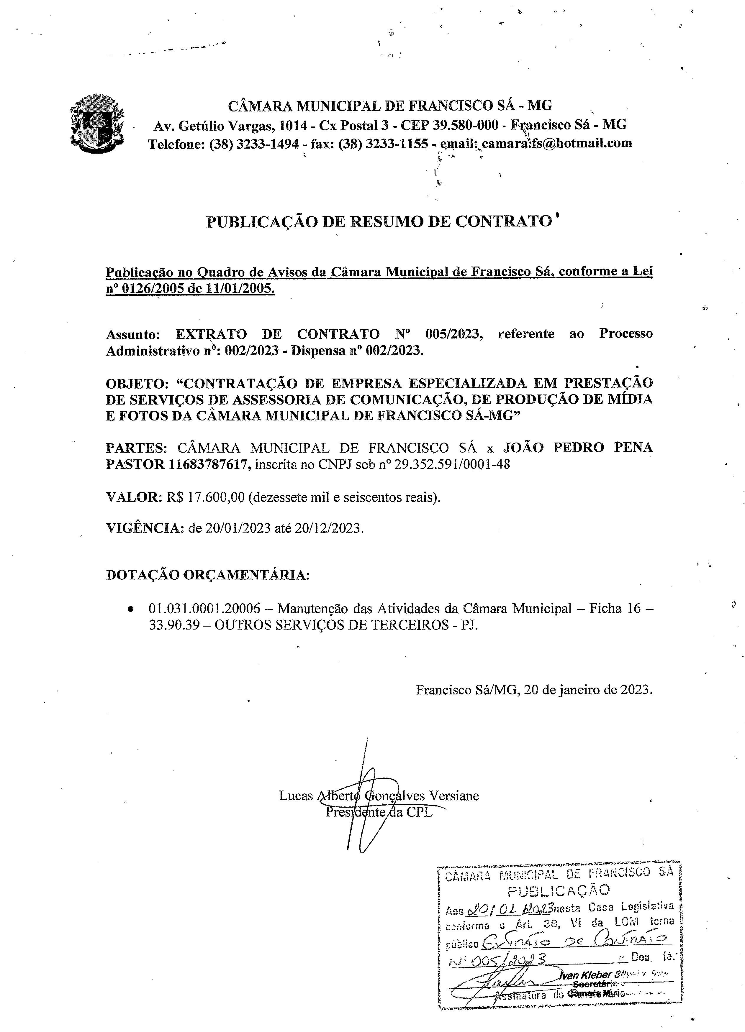 Extrato de Publicação do Contrato N.º 005/2023 - Processo Licitatório N.º 003/2023 - Dispensa N.º 003/2023 - Cargo: Assessoria em Comunicação. - Contratado: João Pedro Pena Pastor