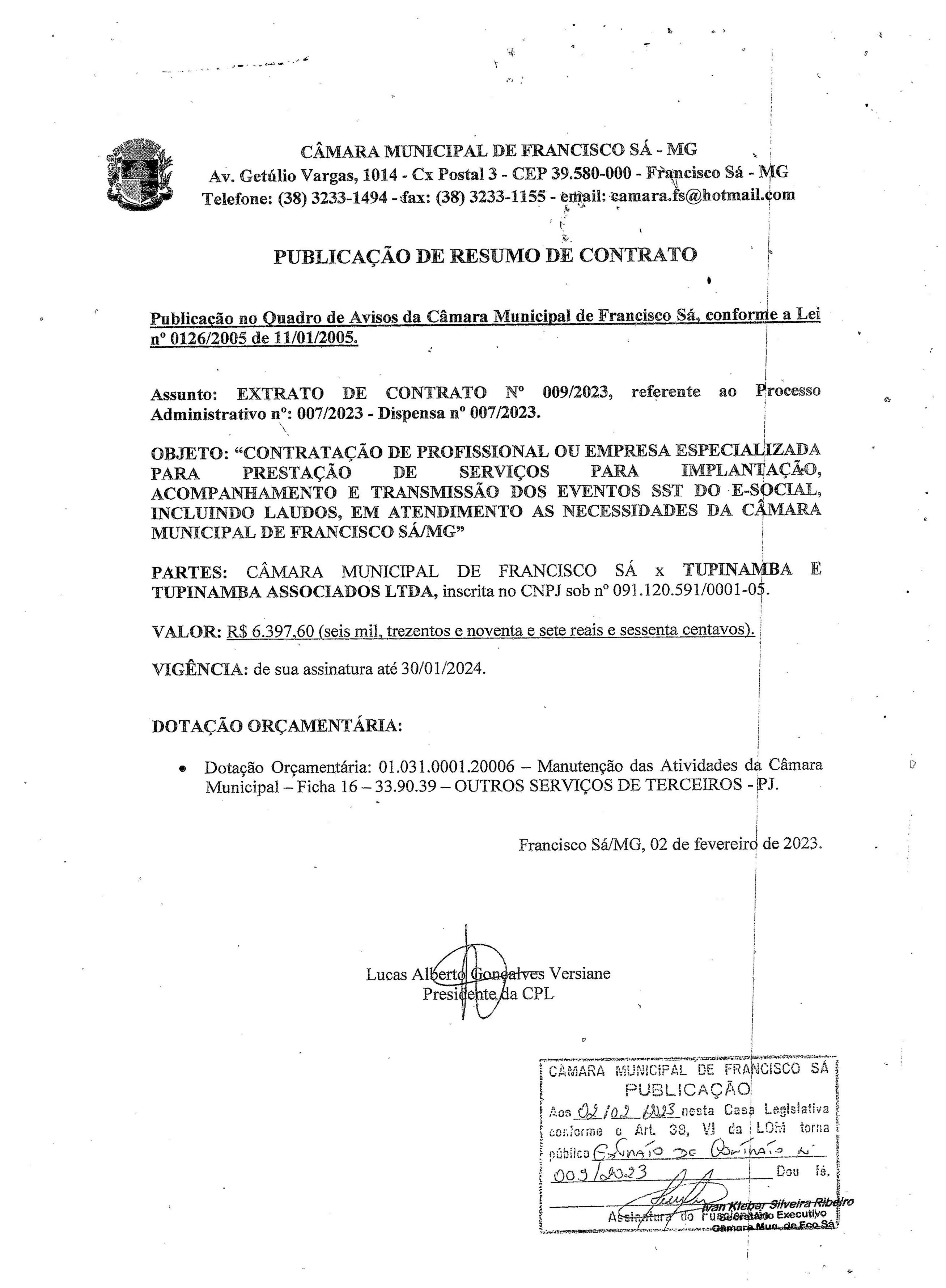 Extrato de Publicação do Contrato N.º 009/2023 - Processo Licitatório N.º 007/2023 - Dispensa N.º 007/2023 - Contratado: Tupinambá e Tupinambá Associados Ltda., CNPJ 091.120.591/0001-05.