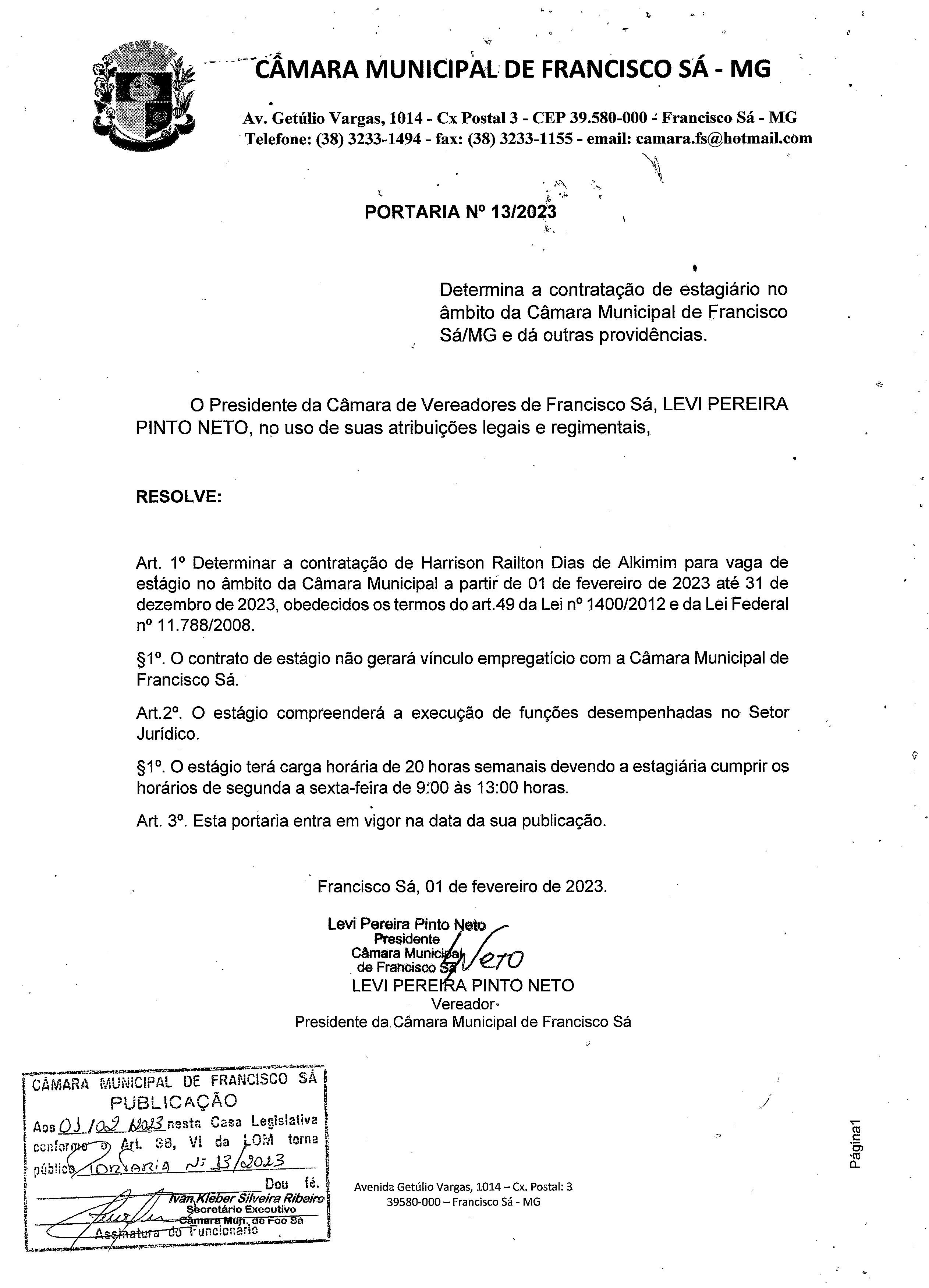 Extrato de Publicação da Portaria N.º 013/2023 - Contratação: Direta - Cargo: Estagiário - Contratado: Harrison Railton Dias de Alkimim