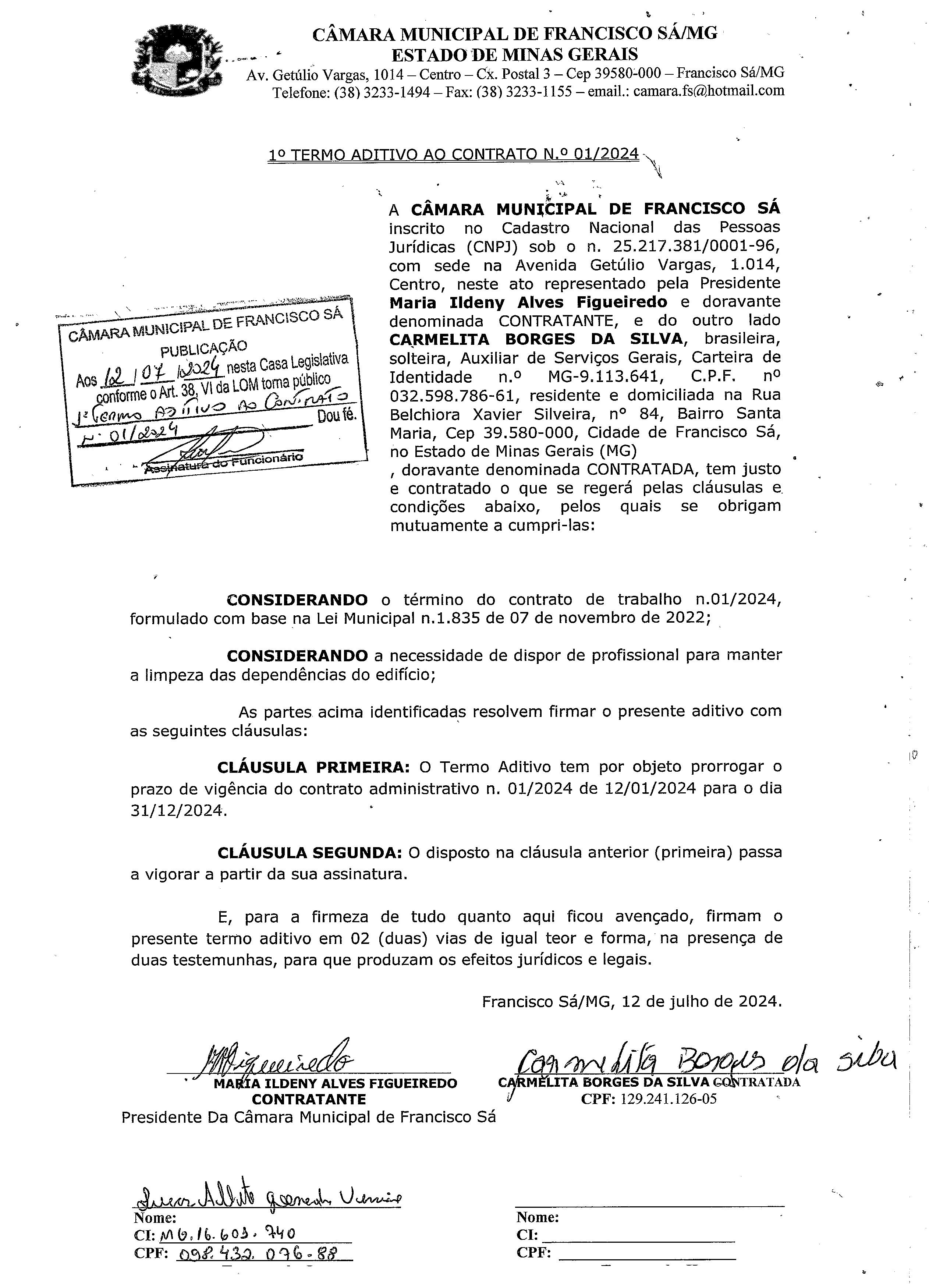 Extrato de Publicação do ADT N.º 001 Contrato N.º 001/2024 - Contratação Direta - Contratada: Carmelita B. da Silva.