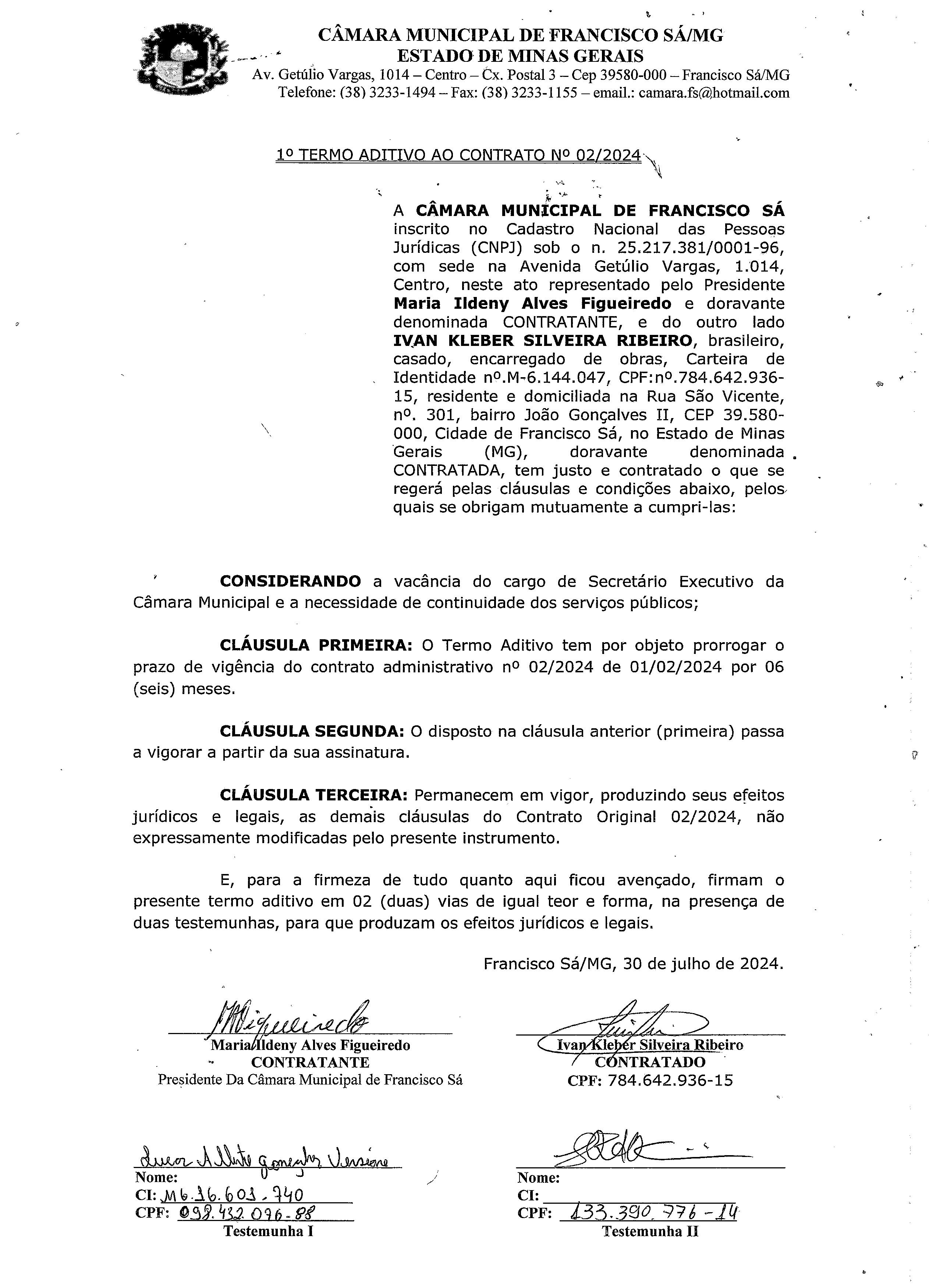 Extrato de Publicação do ADT N.º 001 Contrato N.º 002/2024 - Contratação Direta - Contratado: Ivan Kleber Silveira Ribeiro.