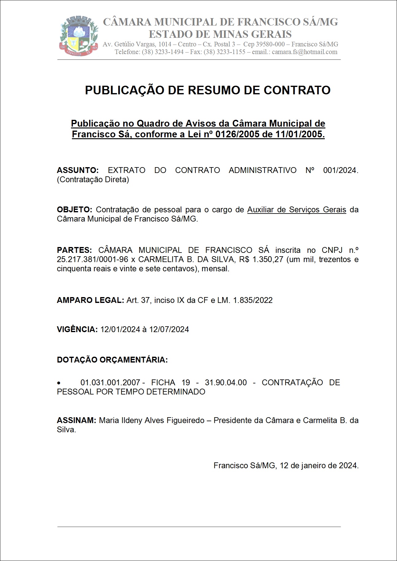 Extrato de Publicação do Contrato ADM. N.º 001/2024 – Contratação Direta - Contratada: Carmelita B. da Silva.