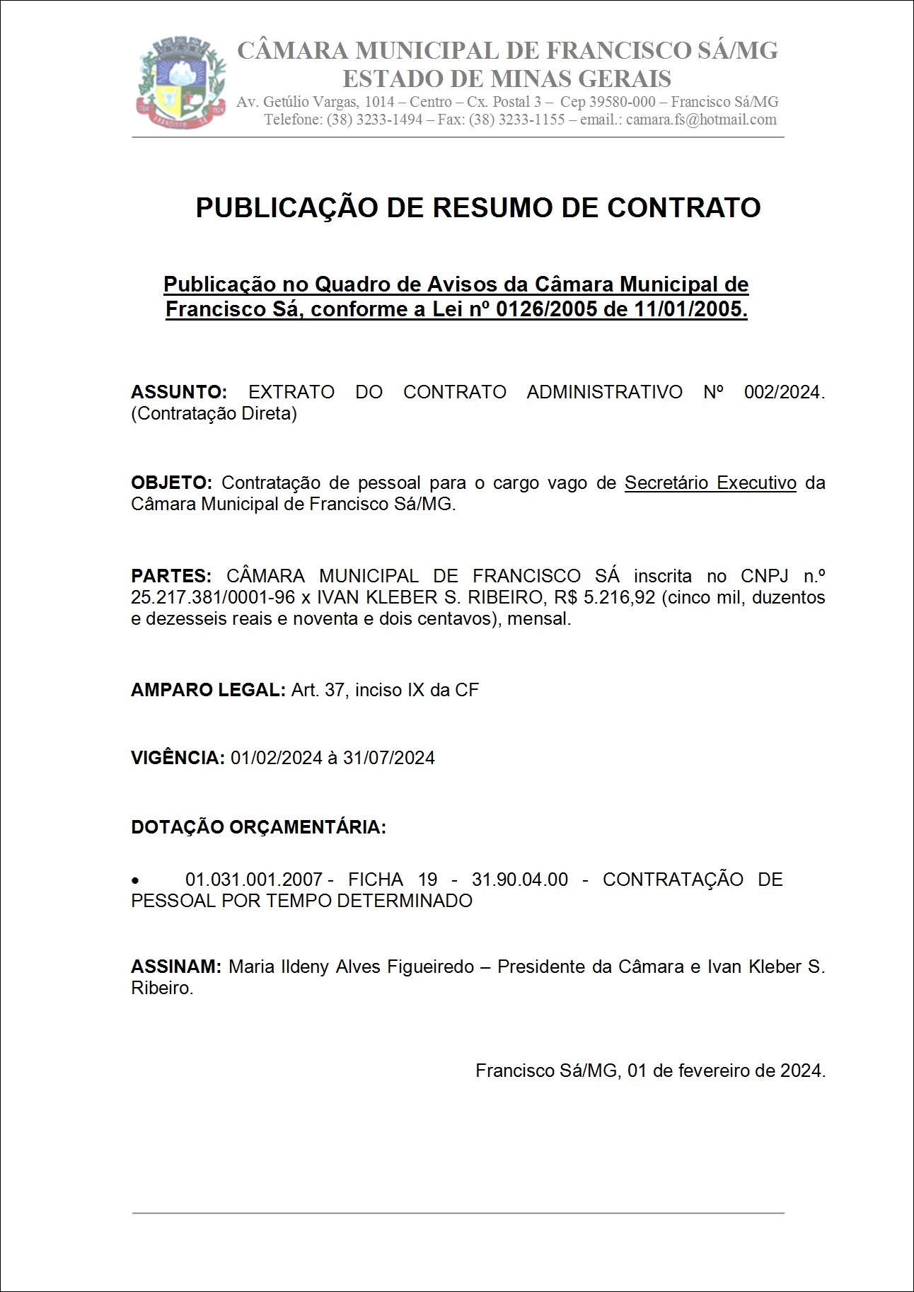 Extrato de Publicação do Contrato ADM. N.º 002/2024 – Contratação Direta - Contratado: Ivan Kleber S. Ribeiro.