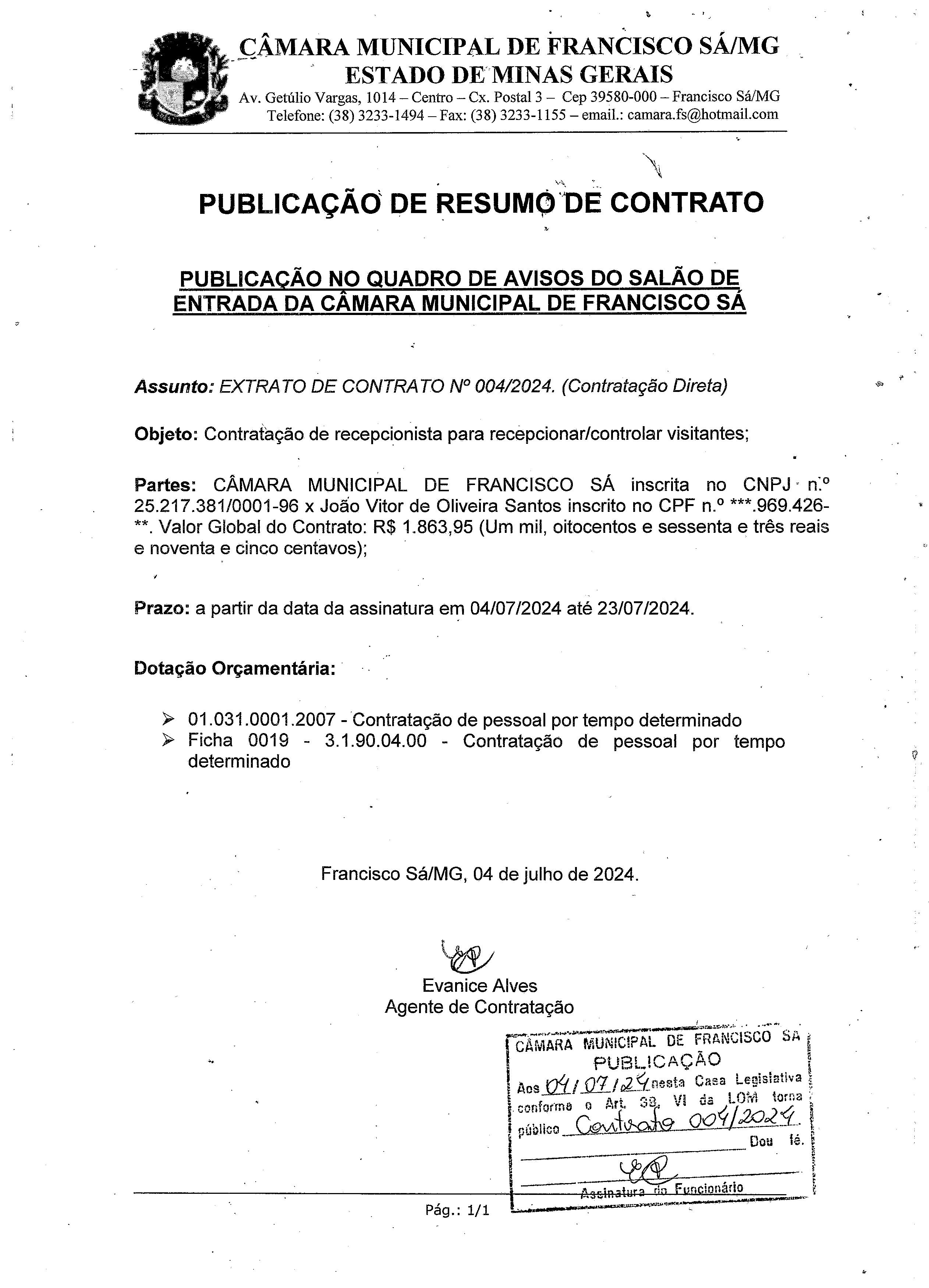 Extrato CTR ADM N.º 004/2024 (Contratação Direta - Recepcionista)