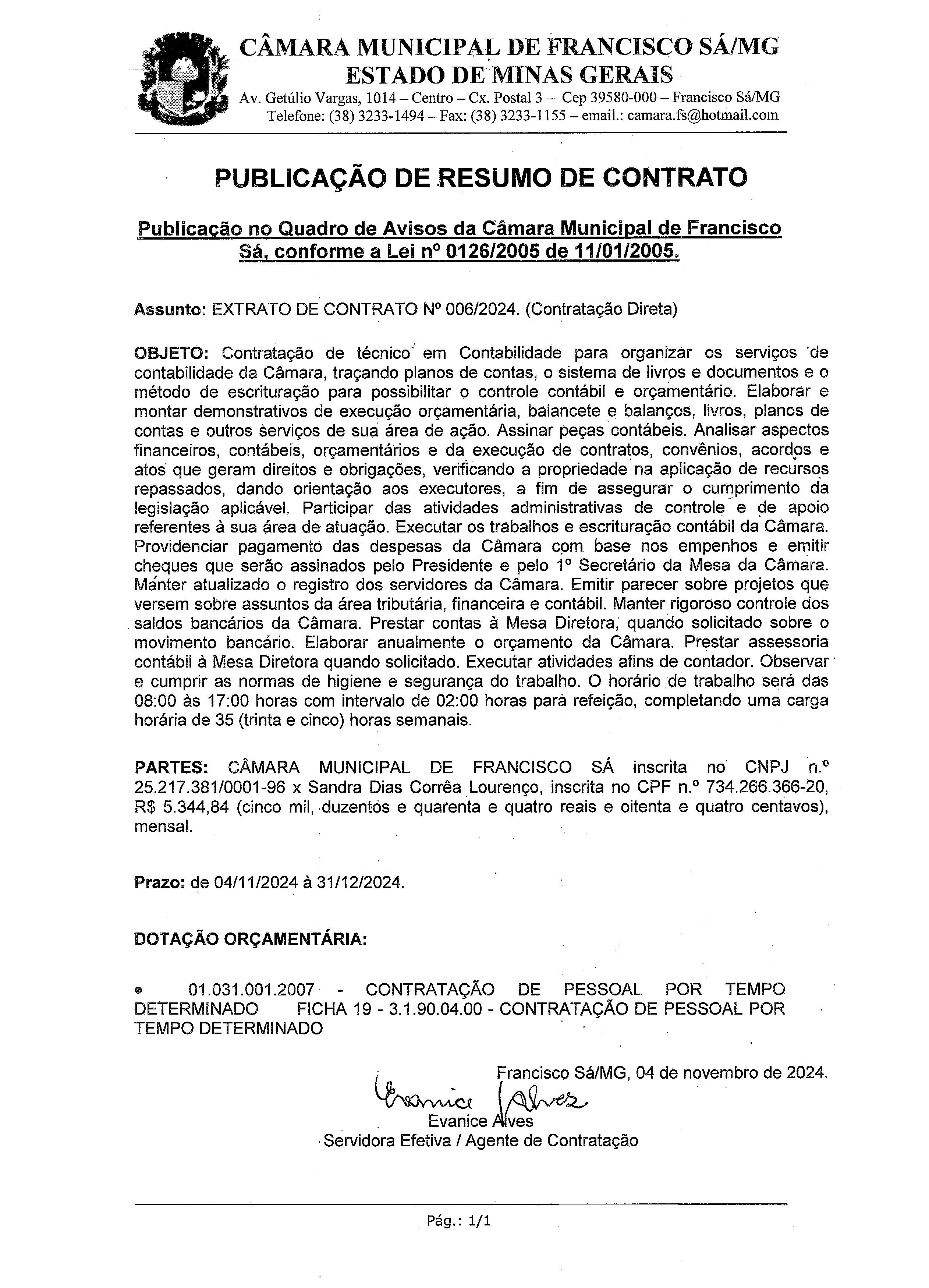 Extrato de Publicação do Contrato ADM. N.º 006/2024 – Contratação Direta - Contratada: Sandra Dias Corrêa Lourenço.