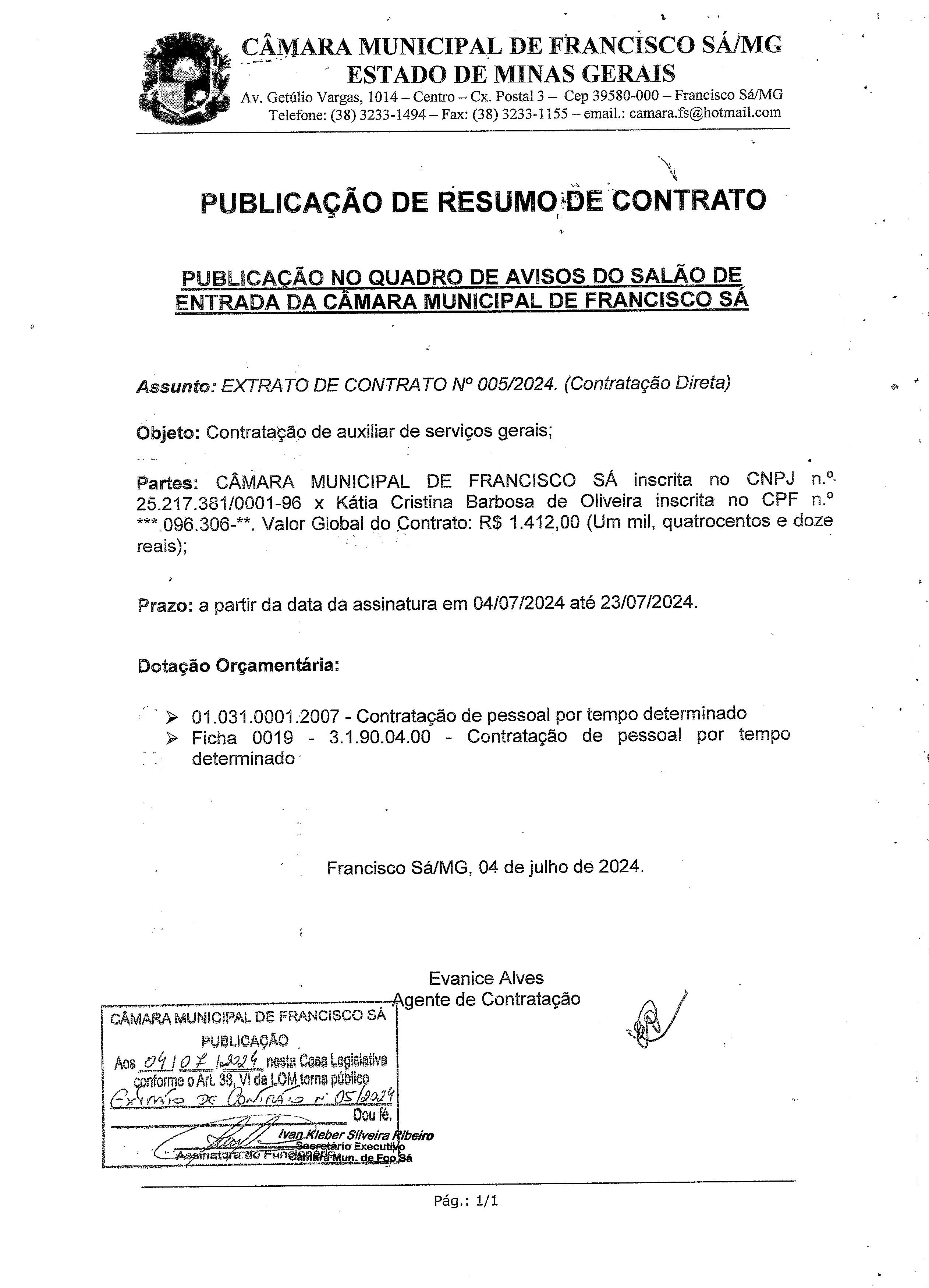 Extrato de Publicação do Contrato ADM. N.º 005/2024 – Contratação Direta - Contratada: Kátia Cristina Barbosa de Oliveira