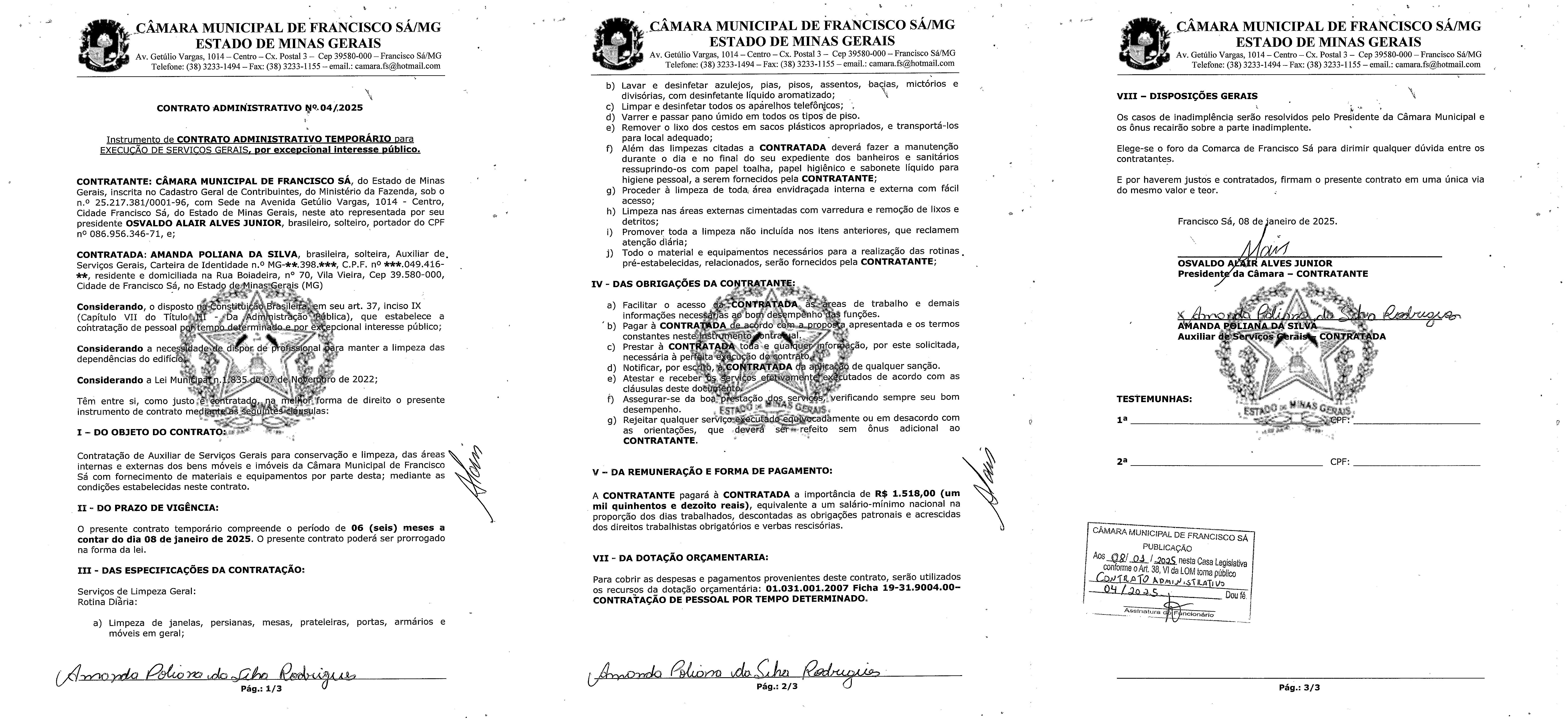 Extrato de Publicação do Contrato ADM. N.º 004/2025 – Contratação Direta - Contratada: Amanda Poliana da Silva.